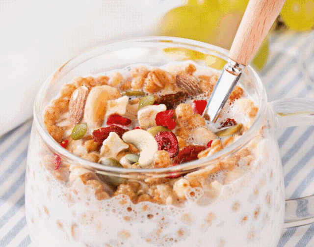 早餐是每天很重要的一餐,但是又常常由于忙碌,重要的卻往往不重視。美好的一天就從簡單而又美味的水果燕麥片開始,合二為一的水果麥片作為早餐,營養又美味。 水果麥片亮點在于將兩類原本營養價值不低的食物聯姻,使得營養素的種類更齊全。水果麥片中所添加的燕麥、黑麥、小麥、大麥等,維生素尤其是B族維生素和維生素E含量很高,且膳食纖維含量豐富,尤其是燕麥含有的特殊膳食纖維----β-葡聚糖,是一種具有降低膳食中脂肪的吸收、吸附多余的膽固醇等多種保健價值的成分