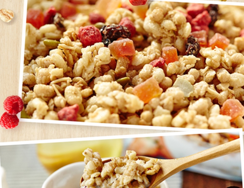 早餐水果麥片選用燕麥,再加上膨化谷物脆經過混合噴涂低溫烘培后,混合果干、堅果等產品,富含膳食纖維和維生素,是營養豐富的早餐選擇。既可以直接干吃,使口感酥脆可口。也可配上牛奶和酸奶,口感會更加,吃起來酸甜酥脆,倒入直接拌勻即可吃,無需等待,完全不用擔心清晨時間不夠。是新時代早餐產品新需求。
