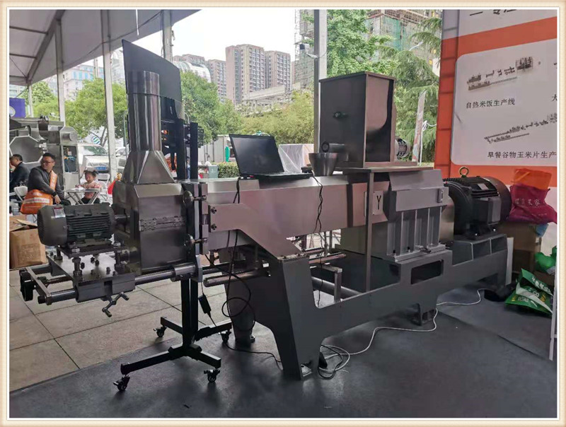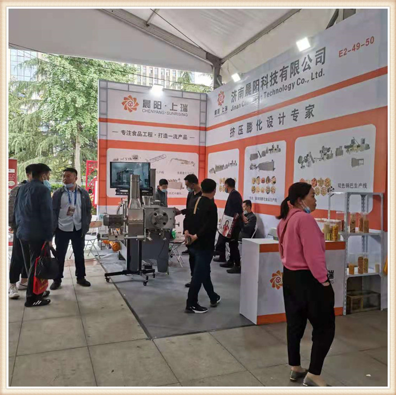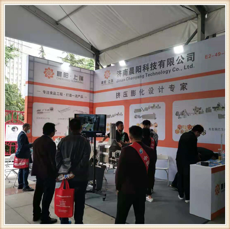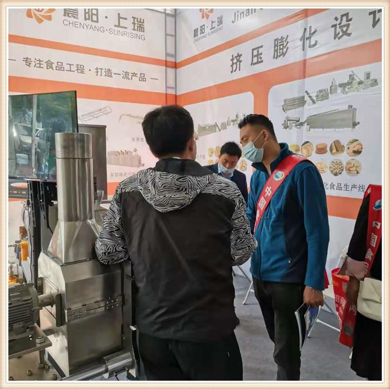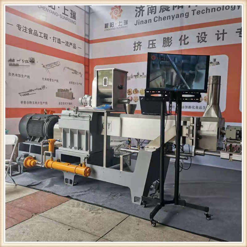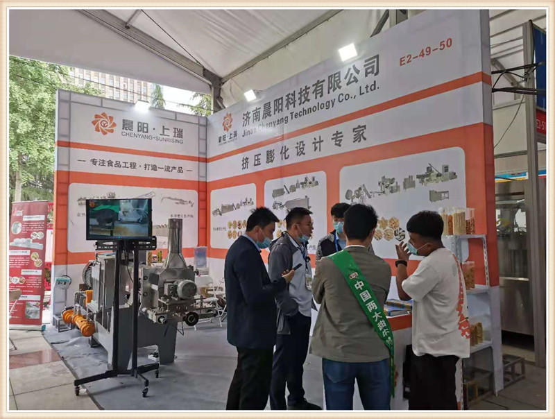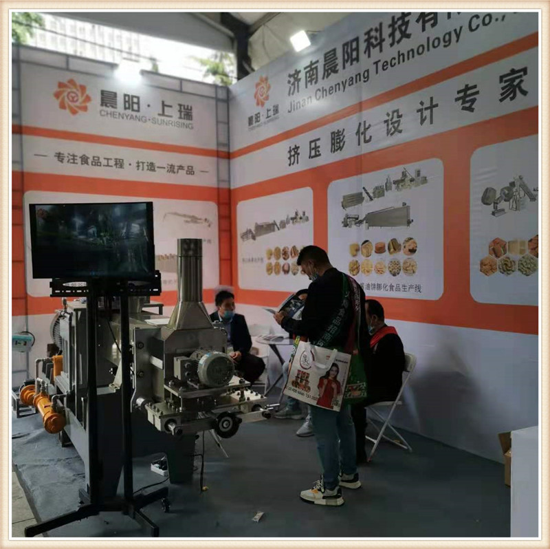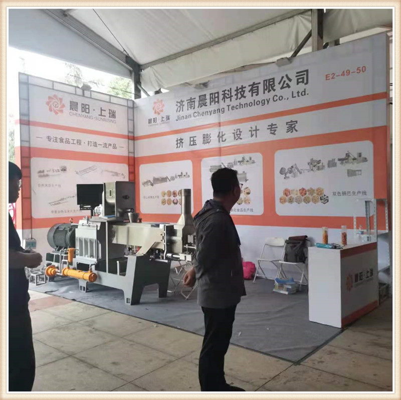 濟南晨陽公司攜帶新款CY65雙螺桿膨化主機亮相第19屆漯河食品博覽會,一經亮相,變引起了眾多膨化食品生產企業的關注咨詢。詳細詢問該新款機型的性能特點,和核心產品加工。該款65主機搭載45kw-6級電機直連傳動,齒輪箱使用原裝南京擠出機箱體,螺桿使用分段積木組合結構,機桶使用內壁噴涂耐磨襯套材料。機桶恒溫控制,PLC自動控制,切割模頭升級。
