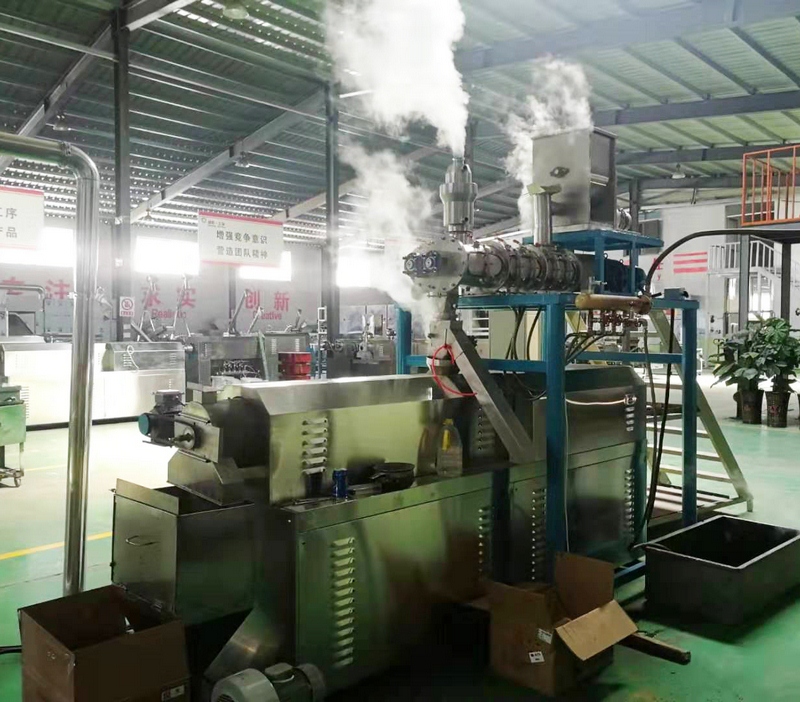 拌粉機→螺旋上料機→(調制)雙螺桿膨化機→風送機→多層烘干機-滾筒調味機