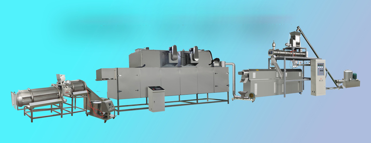 本生產線改變生產工藝流程可以生產寵物食品狗糧、貓糧、魚飼料等產品。鮮肉添加比例可以達到30%,滿足動物對蛋白的營養需求。膨化機可以選用干法膨化和濕法膨化;烘干機可以根據電、燃氣、蒸汽能源使用合理設計;調味設備有單滾筒,雙滾筒連續調味機,單頭自動稱重八角調味機、雙頭八角自動調味機、滾筒式批次稱重調味機等。