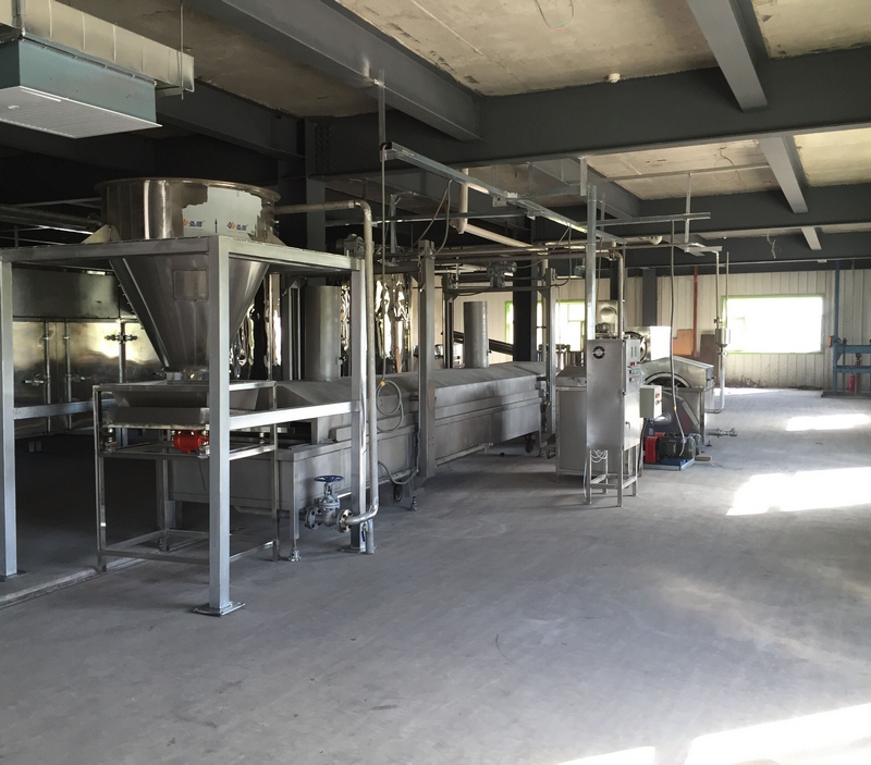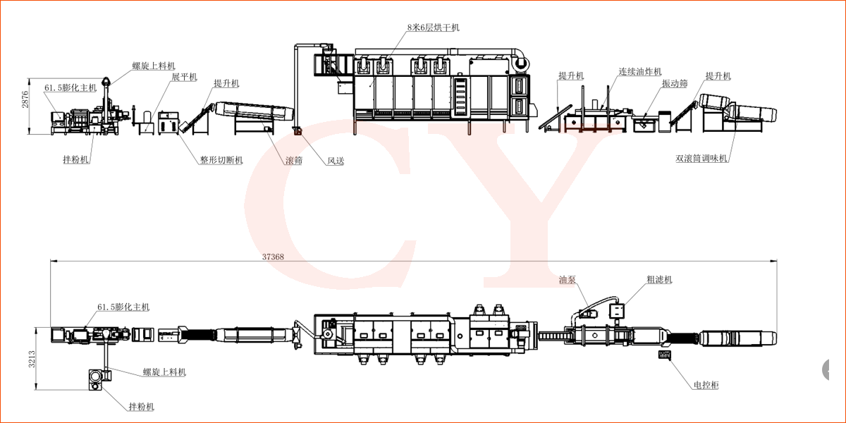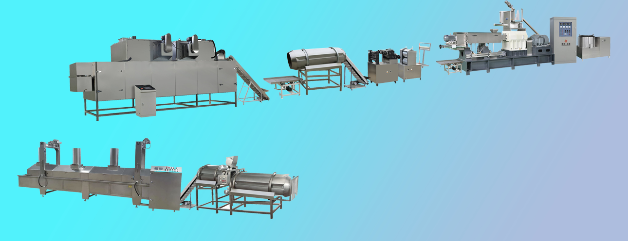 拌粉機→真空上料機→雙螺桿膨化機→展平冷卻機→整形切斷機→提升機-篩選機-提升機-八米五層干燥機-油炸機-震動脫油機-單滾筒調味機