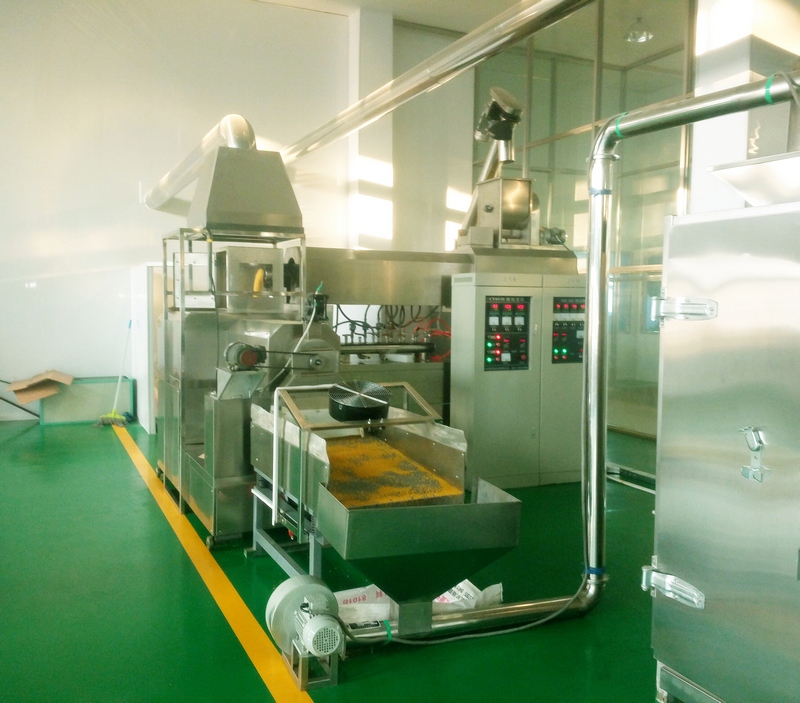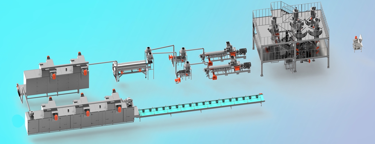 大型生產線:自動配料站→粉碎機→混合機→膨化主機→振動篩-風送機→均質滾筒-風送機-多層振動烘干機→風送機-微波干燥-風送機-二次烘干機-風送機-多層振動冷卻機-Z型提升機-包裝機
