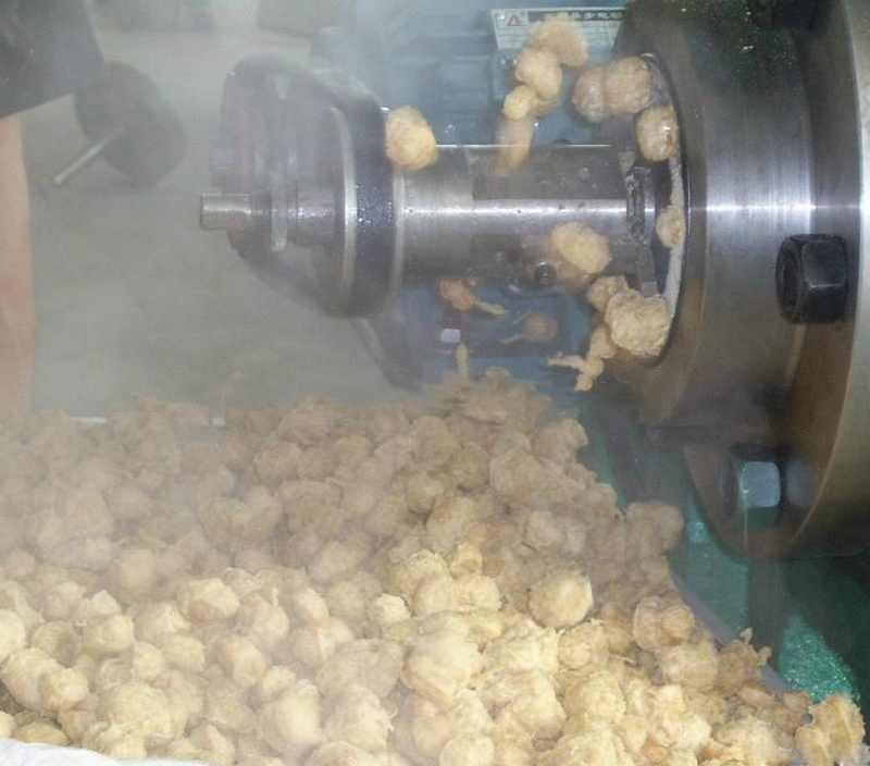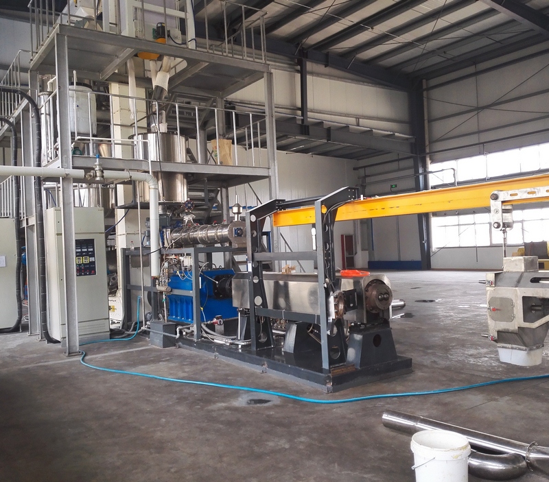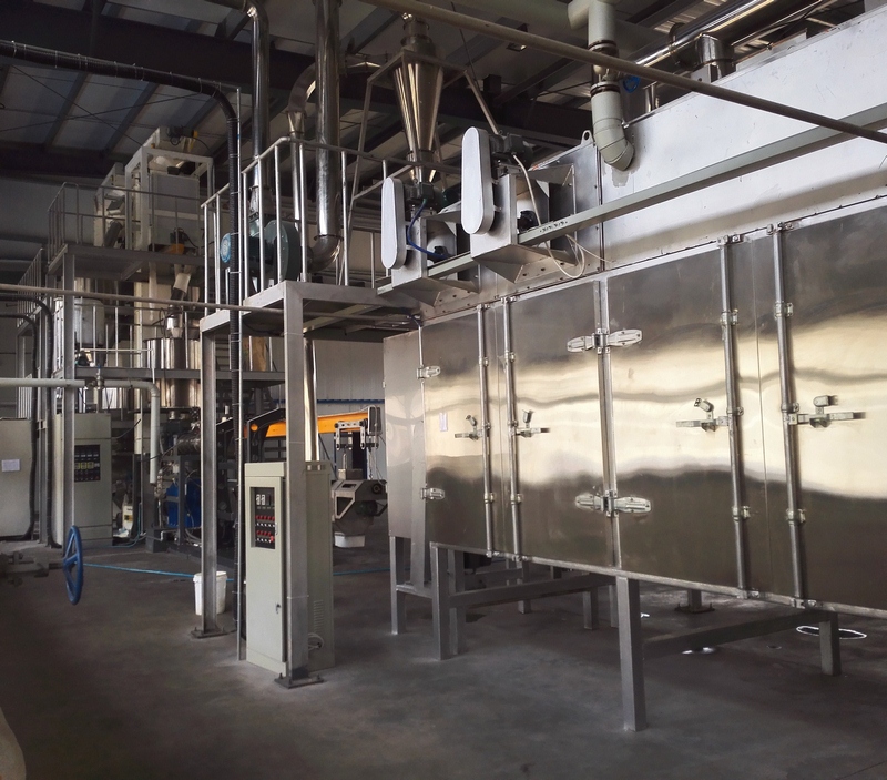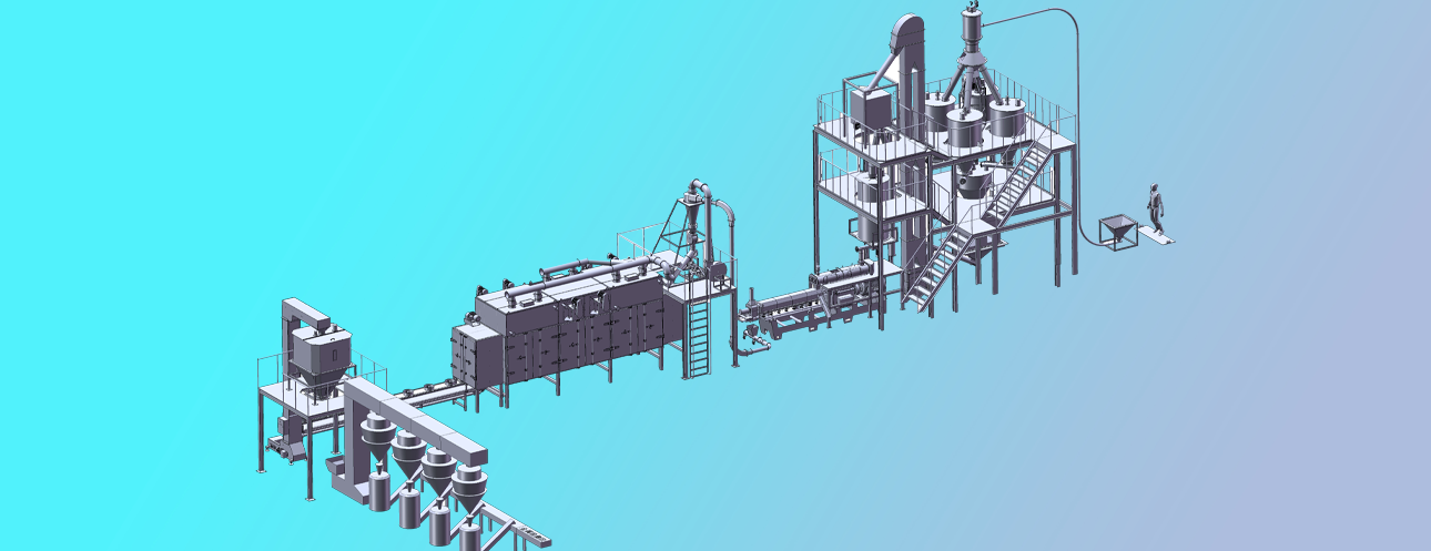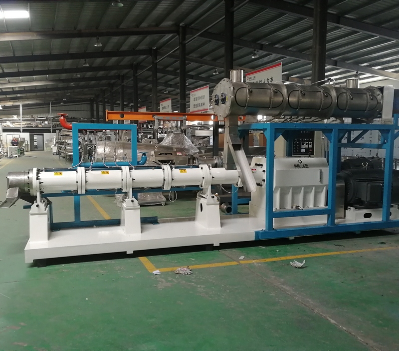 拌粉機→螺旋上料機→雙螺桿膨化機→切斷機→提升機→烘干機