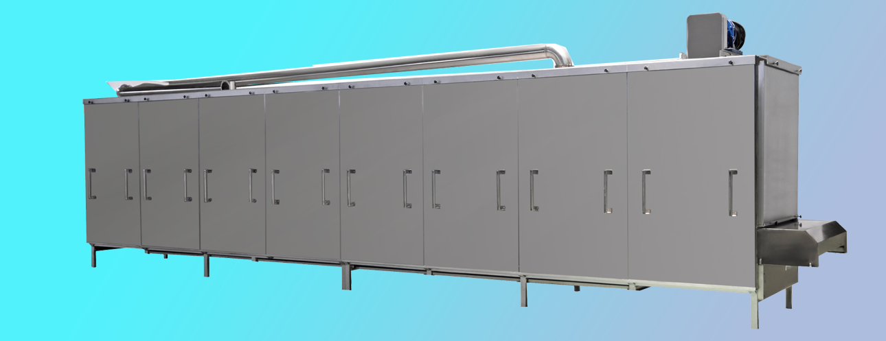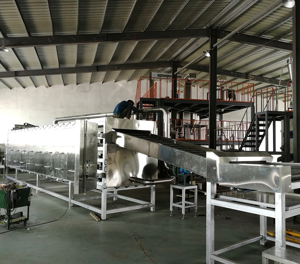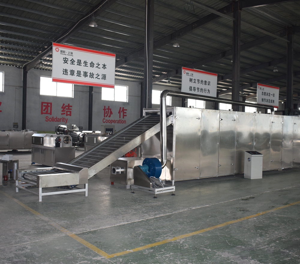 烤箱上料方式:可以直接選用帶爬坡結構和外部借助輸送機送入烘干機料床,直接爬坡的烘干機結構可以更直觀的觀測到物料布料狀況,多用于產量較大的生產線;借助外部上料的烤箱占地面積小,安裝方便,多用于單臺膨化主機的生產線配置