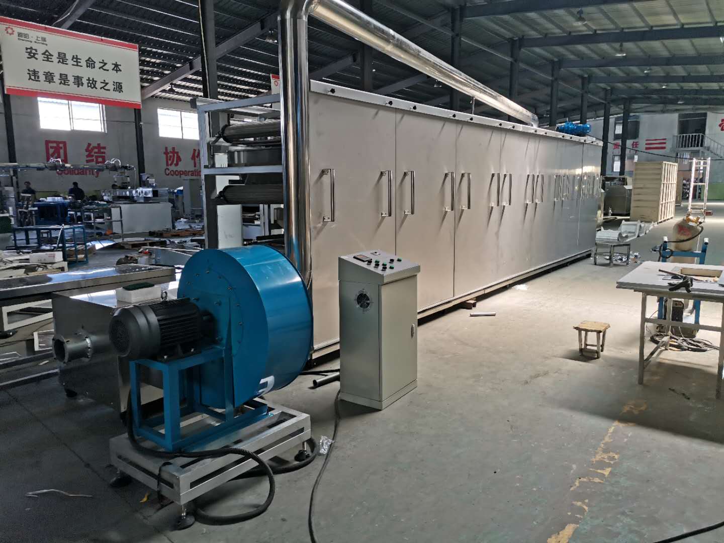 2整機傳動采用雙節距滾子鏈傳動,往返式烘干,運轉平穩無卡阻現象。根據場地和產品可以設計3、5、7層烘干機 ,帶寬規格有760mm\1000mm\1200mm規格