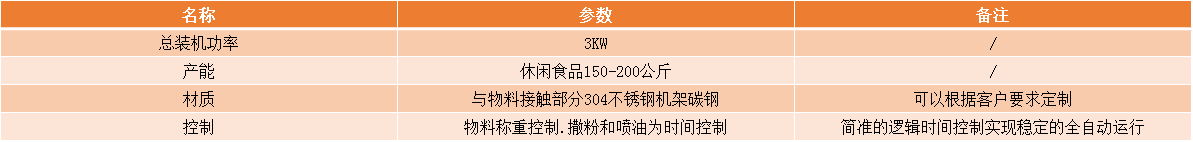 設備組成:400皮帶上料機、50kg稱重斗、25KG調味粉添加機、50L噴油機、50KG正反轉調味滾筒。